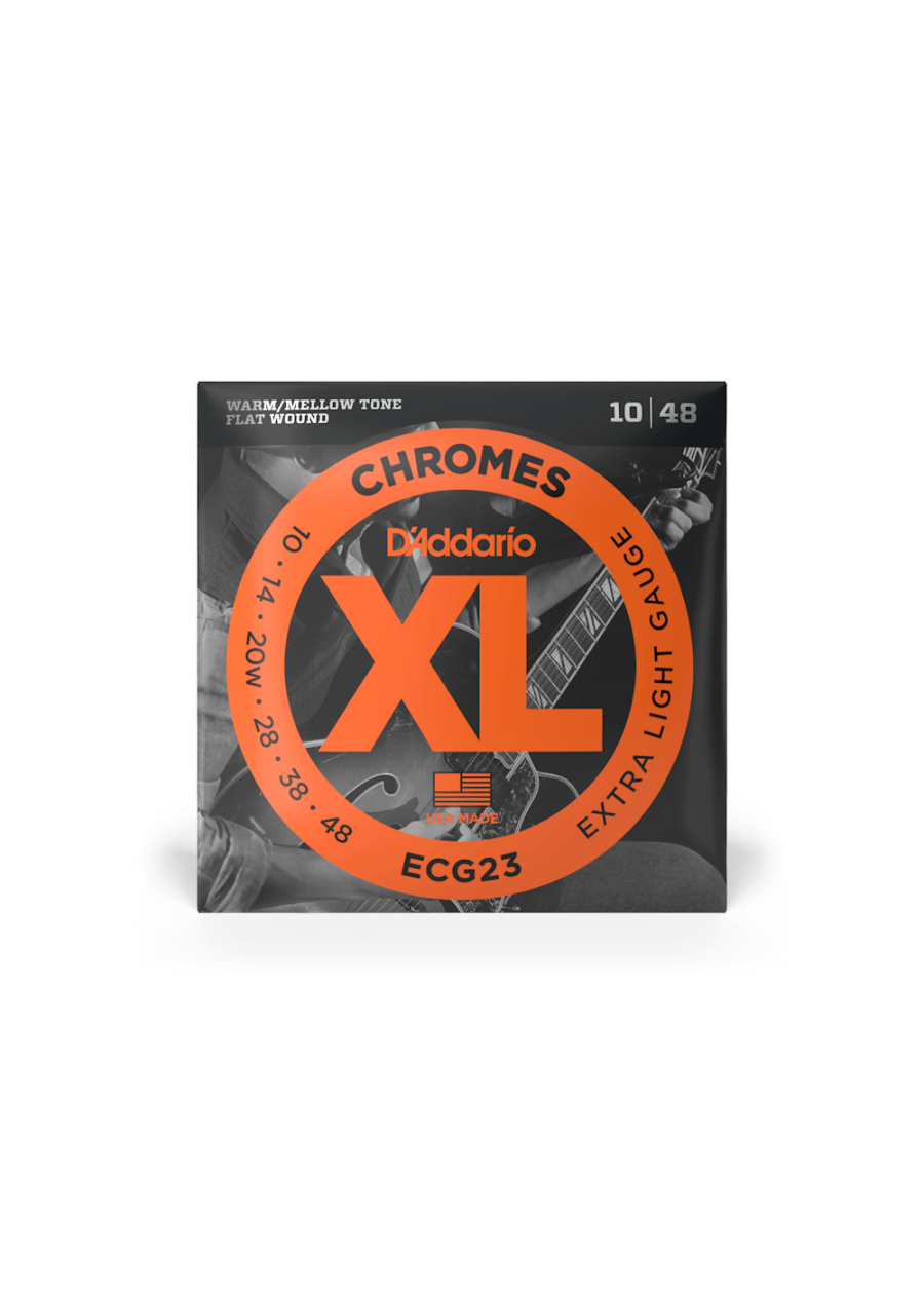 XL Chromes are our warmest, mellowest electric guitar strings. Beloved by jazz guitarists, as well as blues legends like Gary Clark Jr., these flat wound strings provide the smoothest feel and warmest tone, while allowing movement across the fretboard with no finger noise. Made with a high carbon steel core, Chromes’ stainless steel flattened ribbon wire is expertly wound onto a series of interlocking under-windings, then precisely polished for unparalleled smoothness and a sound which blends beautifully into any mix. 10-48 Extra Light is our lightest gauge of flatwound strings.