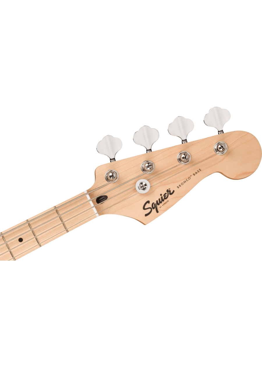 The Squier Sonic® Bronco® Bass is ready to launch any musical adventure into warp speed, offering iconic Fender® style and inspiring tone for players at any stage. This Bronco Bass sports a slim and inviting "C"-shaped neck profile with a narrow 1.5" nut width and a thin, lightweight body for optimal playing comfort while a Squier® single-coil pickup delivers punchy bass tone. Further details of this model include a short 30" scale length, 4-saddle hardtail bridge for precise intonation adjustment, sealed-gear tuning machines for smooth, accurate tuning and durable chrome-plated hardware that is sure to catch the spotlight.