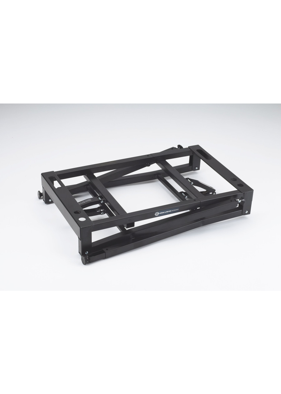 The world-renowned table-style keyboard stand has been upgraded. With a height adjustment range from 600 - 10,00 mm the keyboard stand can now be used while standing or sitting. Adjusting the table does not require any tools. As before our keyboard stand impresses through its stability and flexibility. The stand is equipped with height adjustable legs with integrated levelling feet for uneven surfaces. The keyboard stand is collapsible for easy and compact transport. There is a wide range of expansion options, such as a stacker for a second keyboard, laptop or universal holder, which round off the complete package.