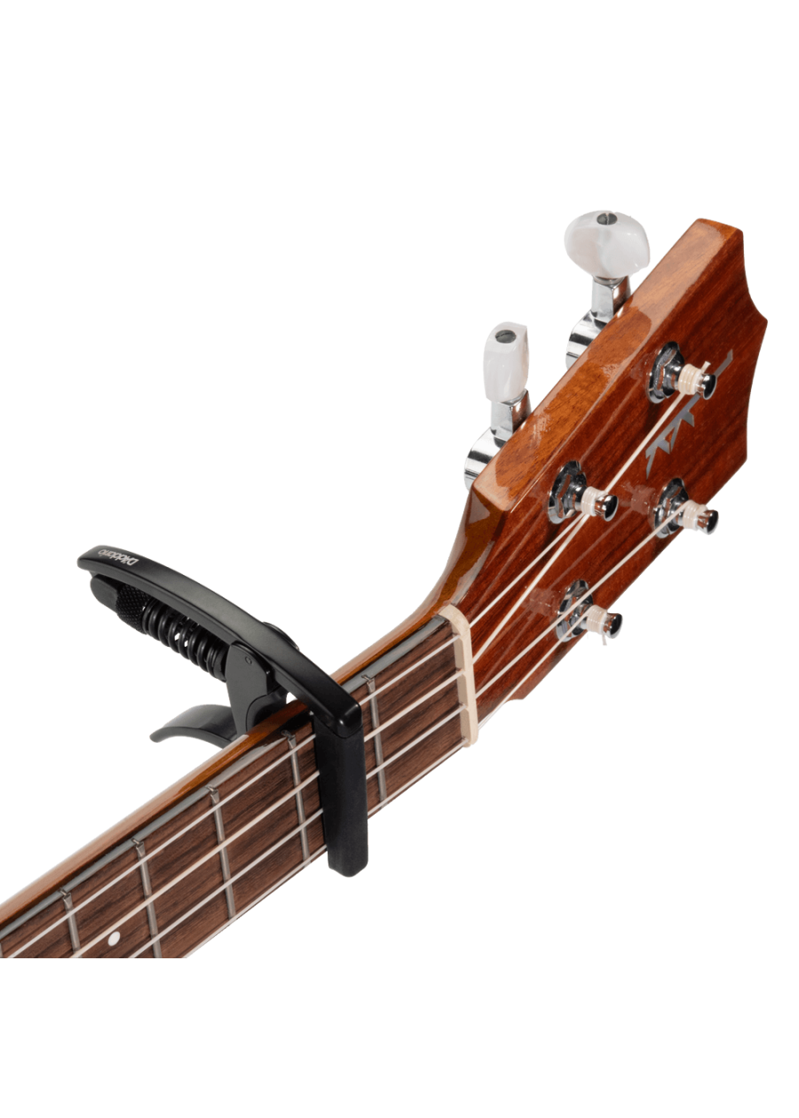 The patented Tri-Action Ukulele Capo reduces the force required to open and close this high-quality ukulele capo, allowing you to dial in the perfect clamping tension for your instrument and eliminates the need to retune during use. The capos micrometer tension adjustment applies direct horizontal pressure for even clamping tension regardless of neck profile. The lightweight construction can withstand the toughest playing/touring schedule while adding negligible additional weight or obstruction to the instrument.