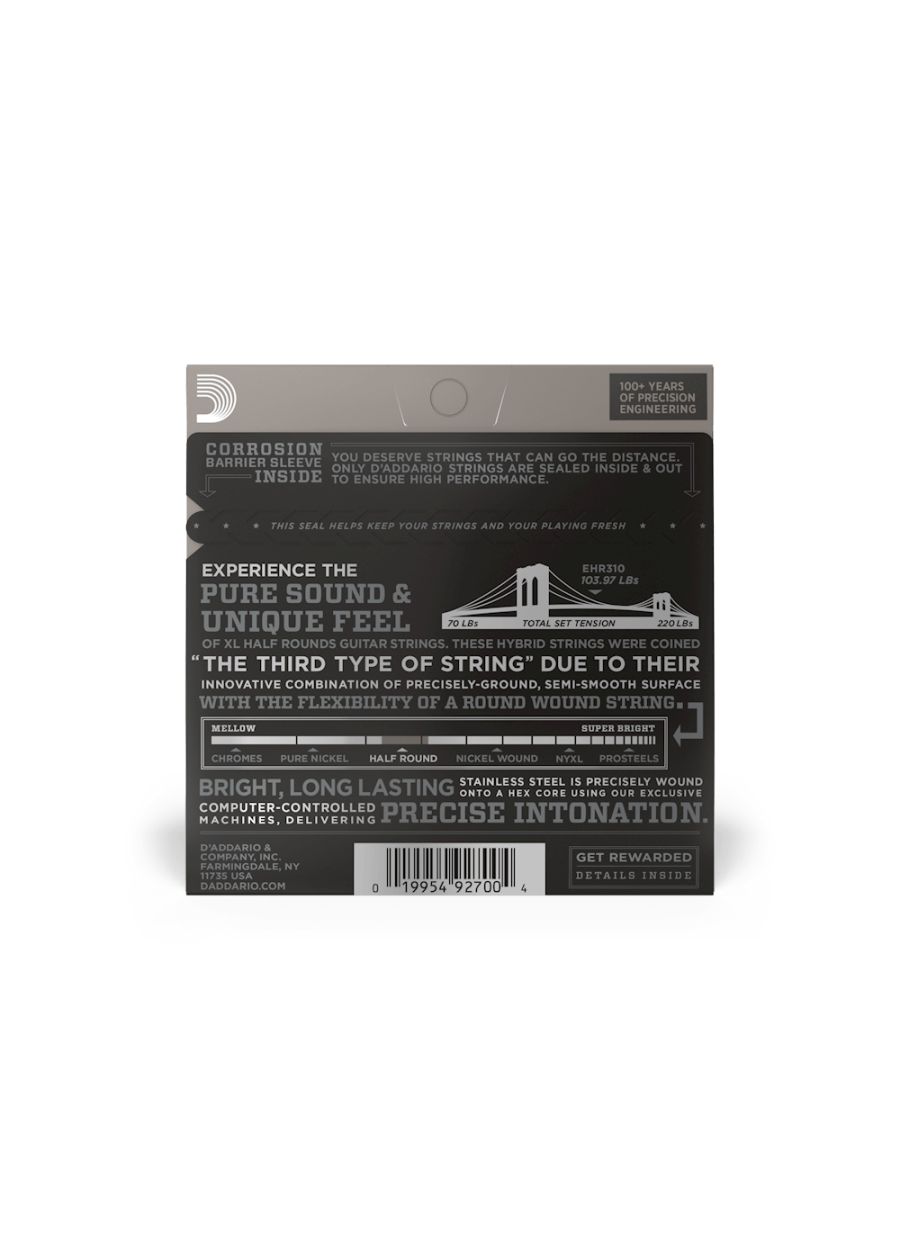 D'Addario Half Rounds are round wound with Stainless Steel and then precision ground, leaving the outer surface smooth and "semi-flat." The result is a string with the flexibility and tension characteristics of round wound strings with a smoother feel, and semi-bright tone, similar to flat wound strings.