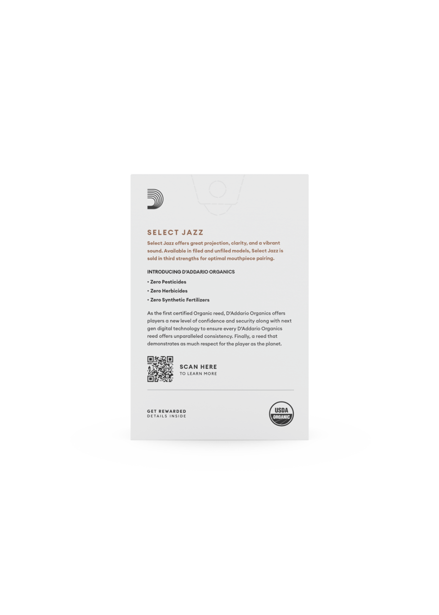 Organic Select Jazz offers great projection, clarity, and a vibrant sound. Available in filed and unfiled models, Select Jazz is sold in third strengths for optimal mouthpiece pairing.