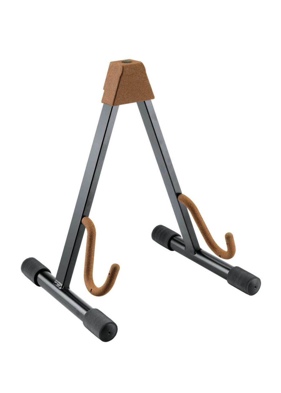 For electric guitars. Stable, sturdy, simple and easy to adjust and fold. Width adjusts from 220 to 350 mm. Support arms are covered with exclusive non-marring material to protect instrument finishes.